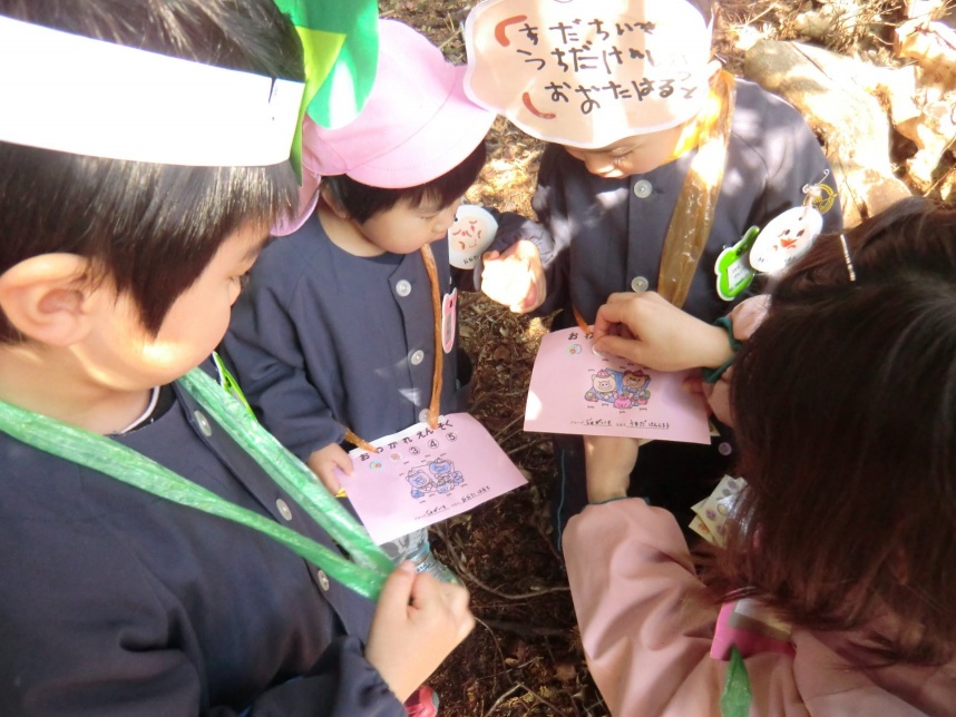 オリエンテーリングでは、ポイントに隠れている先生を探して、シールを集めました。