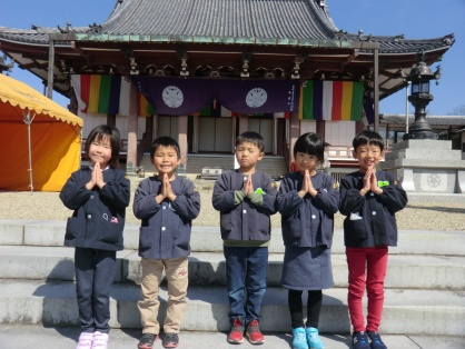 3月5日、年長さんは園児参拝に行ってきました。 三河別院まで行き、斎料理を頂きました。 その後、大谷保育加盟の他園の年長さんと一緒におつとめを行いました。 本堂は、大きくて広く、少しドキドキしましたが、 日頃、園で理事長先生ともおつとめの練習をしていたのもあり、 大きな声でお経を読むことが出来ました。 参拝が上手にできたので、その後、三河別院の職員の方に、楽しい人形劇を見せていただきました。