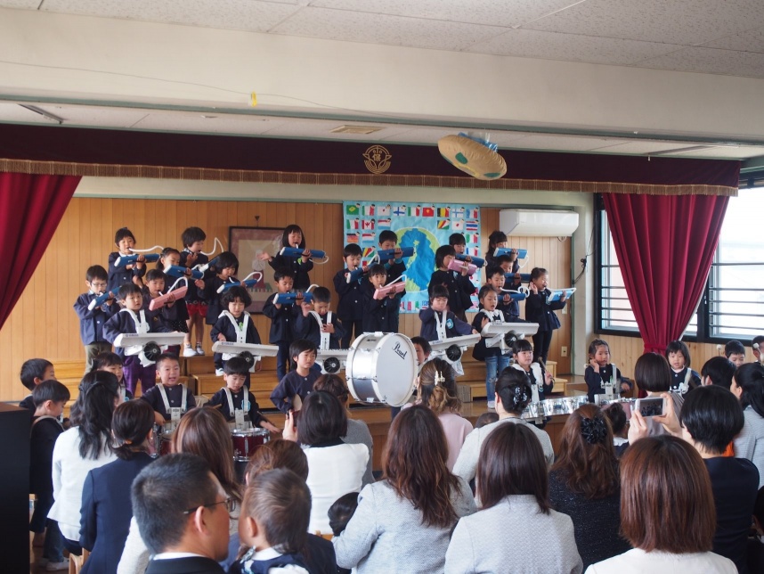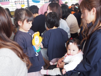 新入園児はもちろん、保護者の方々も初めての保育園にドキドキしているようでしたが、会の中で年長さんの鼓笛の発表を見たり、皆で『さんぽ』の歌を一緒に歌ったりし、最後には在園児からプレゼントをもらって、とても温かい会になりました。