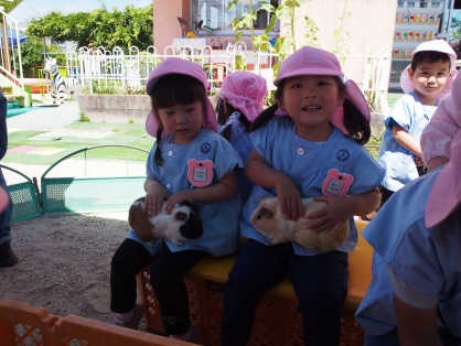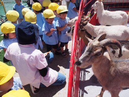 最初に、いちご動物園の方から触れ合いの仕方や動物たちのお話を聞きました。その後、犬・ヤギ・モルモット・カメ・ウサギ等色々な動物たちを間近で見たり、エサをあげたりして、触れ合いを楽しみました。元気のいいヤギ達にびっくりしながらも、嬉しそうにキャベツやニンジンをあげる姿や、モルモットを優しくお膝に乗せてなでなでする姿など、どの子もとても楽しそうな表情をしていましたよ。