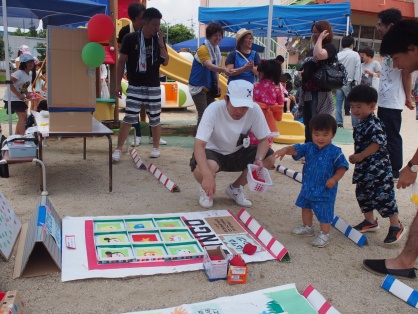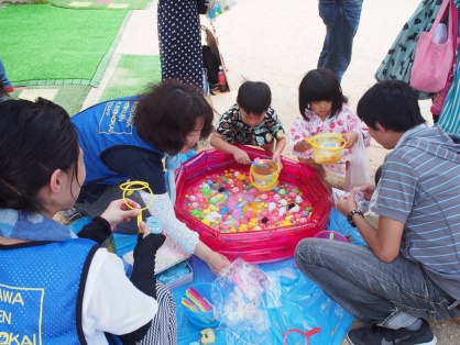 発表の後は、楽しみな父母の会のお父さんお母さんによるバザーのゲームです。手作りの的あては、乳児さんから幼児さんまで楽しめるように工夫して作って下さいました。スーパーボールすくいも人気でした。当日までの計画や準備など、見えない部分のご協力もあったと思います。おかげで、七夕音楽会が中でも外でも盛り上がりました。