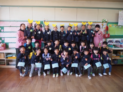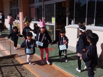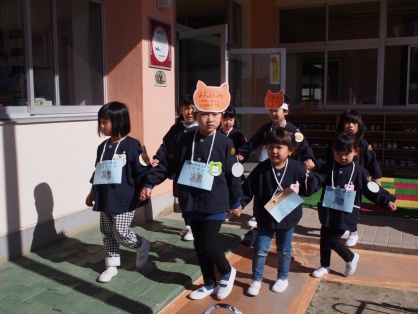 2月に入ってから、ワッペングループという異年齢交流を4回積み上げてきました。一つのクラスを5つのワッペンのグループに分け、年長・中・少のグループで交流をします。年長さんをリーダーとして、年中さんは年長さんへのあこがれを持ち、年少さんは次年度の縦割りクラスへの経験として行っています。お別れ遠足では、ワッペングループの最後の思い出作りとして、グループでオリエンテーリングを行います。オリエンテーリングでは、園内に隠れた先生を探して、先生からシールをもらいます。年長さんが、年中・少さんをリードする姿が見られたり、みんなで1階、2階を何度も行き来して一生懸命探したりと意欲的に参加していましたよ。「みて!全部シールみつけたよ!」と自慢げにカードを見せてくれて、満足気な表情から、園内ではありましたが、十分楽しむ姿が見られました。