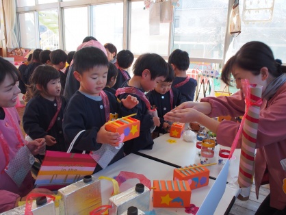 1月31日にお店屋さんごっこを行いました。乳児クラスも、それぞれの子がお財布とお買い物袋を両手に抱え、お買い物に挑戦しました。いろんな品物が並んでいる中、子ども達は目を輝かせながら「どれにしようかな。」と選んでいましたよ。最初の1つを買うことに中々踏み込めず立ち止まってしまう子保育士と一緒に買うことで自信がつき、次の商品からは1人で買うことができていました。