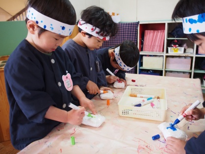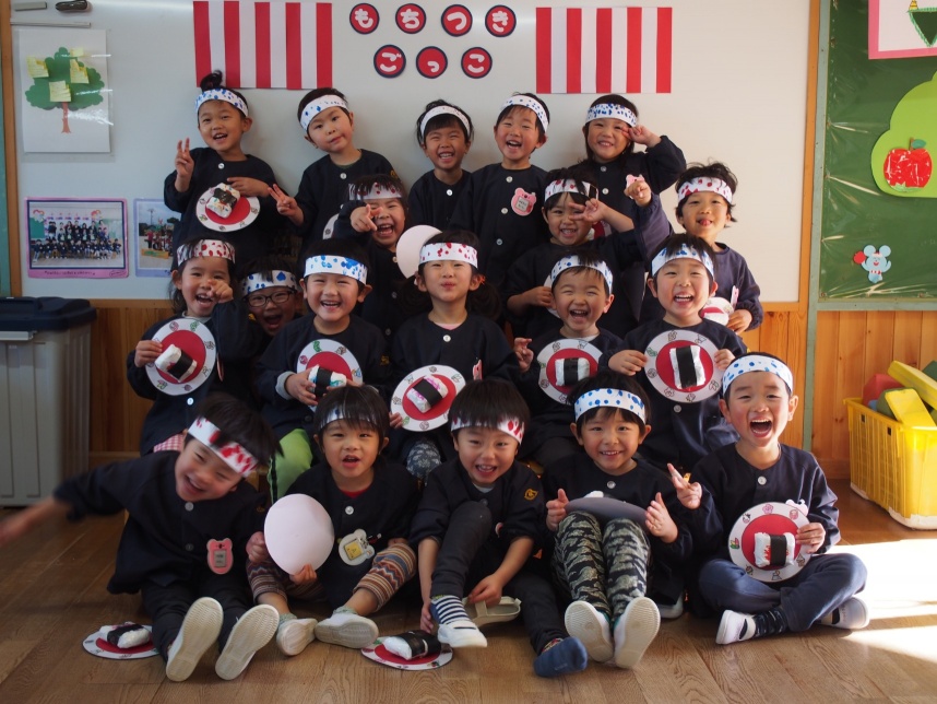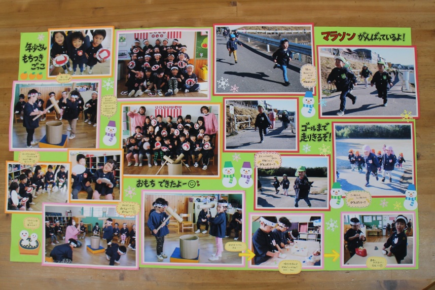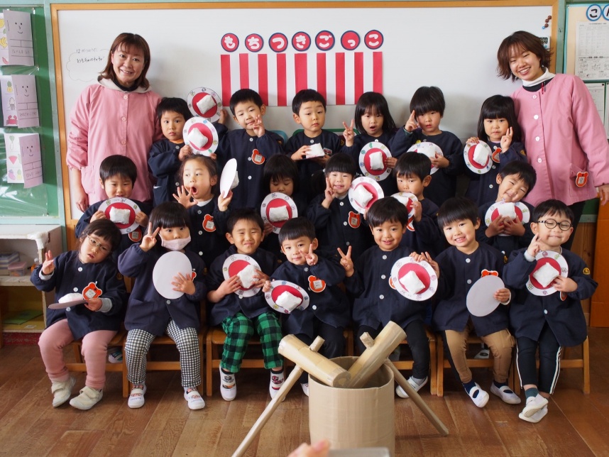 年少たい・らっこ組のお部屋では、お正月に向けてのお楽しみ行事『おもちつき大会』をクラスごとで行いました。段ボールで作った臼と杵を用意し、子どもたちお手製のハチマキを頭に締めると、子どもたちの気持ちも高まります。やる気満々!元気いっぱい 「よいしょ~!よいしょ~!」 と、かけ声が響きわたりました。 つきたて紙細工のおもちに、きなこ・しょうゆ・のり・ごま・さくら・あんこ、などの好きな味で色塗りをして完成!大満足の笑顔でみんなで見せ合って、大事に持ち帰りました。おうちで上手にお話ができたかな。