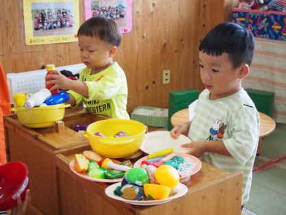 雨降りの日には、室内でおままごとや、ブロック、新聞紙を使って等、室内ならではの遊びを夢中で楽しんでいます。