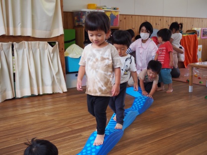 先日は、年少のクラスから、バランスを取りながら進んでいく玩具を借りてきて、室内で楽しみました。上手にバランスを取りながら進む子、途中でバランスが崩れ、足がついてしまう子、いろいろな姿がありましたが、みんなとても楽しそうに何度も繰り返していました。