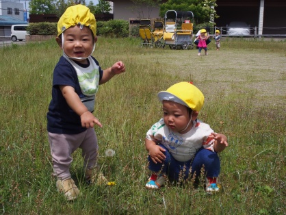 6月中旬、お散歩カーに乗ってお散歩に出かける あひる組さん。この日も近くの公園へ行きました。道中、興味のある物を見つけると 嬉しそうに指を指したり、声を出したり…。公園に着くと、あちこち歩き回ったり お花や草に触れてみたりと、気持ちのよい風が吹く中で、外の空気をたくさん吸って思い切り楽しみました。