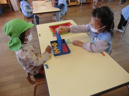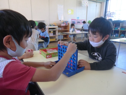 縦・横・斜めのどれか4つ同じ色を揃えた方が勝ちという『4目並べ』という遊びも楽しんでいます。とても頭を使う難しい遊びですが、最初は先生からルールについてしっかり話を聞き、少しずつ理解して子どもたちで遊びを進めることが出来ています。「先生とやりたい!」と誘ってくれる子もいるのですが、子どもたちの頭の回転の速さに驚かされ、子どもたちに負けることも少々…。