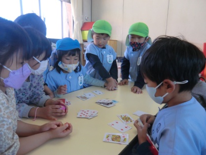 トランプでは、ババ抜きや193はもちろんですが、最近の子どもたちのお気に入りは『スピード対決』です。やりたい子がたくさん集まると、先生と順番を決めたり、自分たちで対戦表を作ったりして、真剣勝負が始まります。見ている友だちの応援も熱が入り、「5出せる!早く!!」「○○くん、いけー!」と大盛り上がりです。