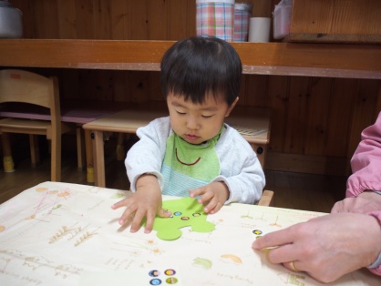 あひる組さんとあひる1組さんは『シール貼り』も大好きな遊びの1つです。どの子も指先を上手に使って台紙からシールをはがし、たくさん貼っていくことを楽しんでいます。以前は、指先でシールをつまむことが難しかったり、自分の指に付いたシールがはがれず困ってしまったりすることも…。成長し、できることが増えた今は「やる!やる!」と先生から渡されるシールに喜んで手を伸ばしている子どもたちです。