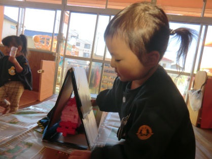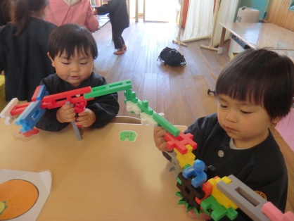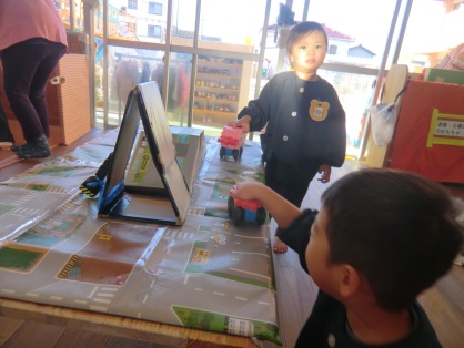 ブロック遊びでは、車を作って道路のマットで走らせる子、色々なブロックを組み合わせて、はしご車やショベルカーといった、はたらくくるまを作る子がいます。また、友だちと一緒に作って遊ぶ子、友だちの車に憧れて一生懸命部品を集めて同じように作って遊ぶ子、そして、作った物をとても嬉しそうに先生に見せてくれる子もいます。