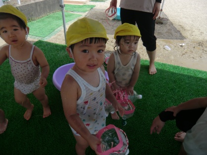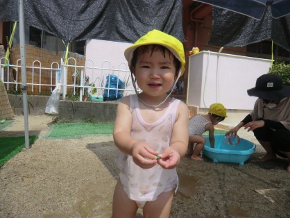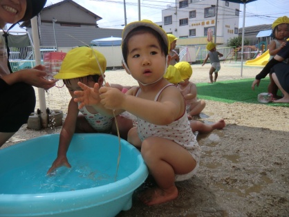 水遊びが楽しい季節になり、こどもたちは元気いっぱい水遊びを楽しんでいます。あひる1組では、仲の良いお友だちに近づいていき、そーっと水をかけて笑う子や、シャワーの水を「雨だ雨だー!」と言って喜ぶ子など、それぞれが水に触れながら楽しんでいます。 子どもたちの目には、穴を掘って水を入れたらそこはお風呂になり、その水が流れていけばそこは川になったりと、想像力豊かな世界を持って遊びを楽しんでいます。