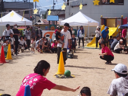 心待ちにしていた親子競技では、抱っこしてもらったりボールを運んだり…。どの子もニコニコ笑顔で 嬉しそうな年中さんでした。
