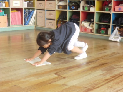 年中長さんは、給食の後に お掃除の時間があり、みんなでお部屋の床を雑巾がけしています。10月頃からは、年少さんも雑巾がけをやってみようと、お掃除の時間が始まりました。