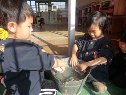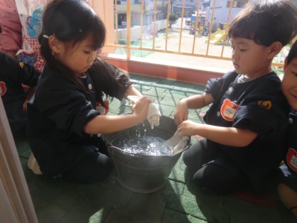 最近は、雑巾絞りにもチャレンジ!温かいぬるま湯が入ったバケツの中で、クルクルと雑巾を丸めて、ギューっと絞るのも少しずつ上手になってきましたよ。