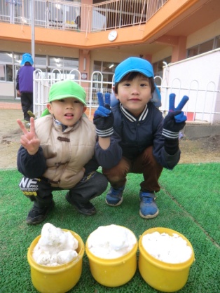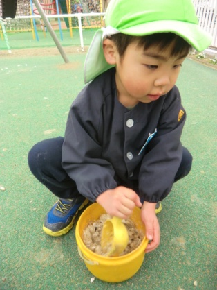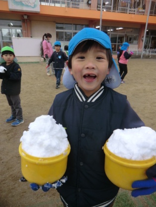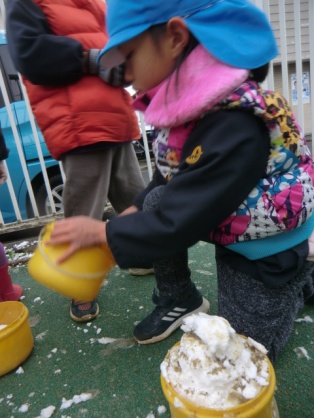 白い雪はご飯みたいで、砂と一緒にバケツに入れて混ぜて楽しんでいる子もいました。