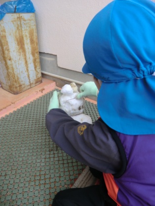 雪だるま作りでは、雪がある所から雪を集めて作りました。雪だるまの形が出来ると、「目は何がいいかな?」「口はどうする」「手は木がいいんじゃない?」と友だちや先生と話しながら作りました。