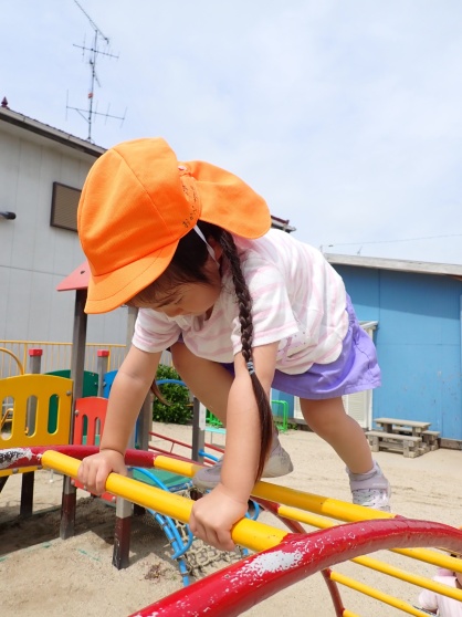 大きい黄色の滑り台、鉄棒、太鼓橋、ハニカムジムは、先生が近くで見守り、時には援助をしていきながら、子どもたちは正しい使い方で安全に楽しく遊んでいます。