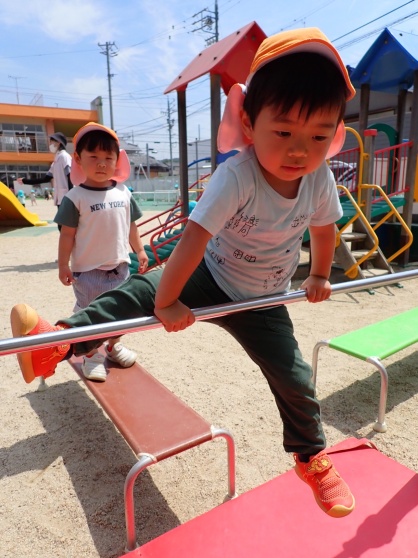 鉄棒では、前回りに挑戦する子、豚の丸焼きをやる子、ぶら下がってみる子、いろいろな遊び方で遊んでいます。
