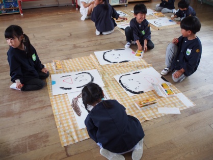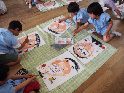 絵の具の筆を持って、嬉しそうに塗り始める子どもたち。大きな画用紙に描いた大きな顔に色を塗り終えると、「できたー!」と満足気な様子でした。