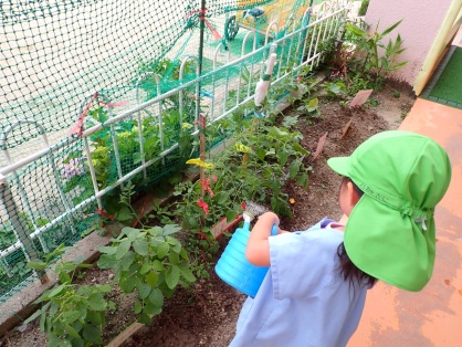 外遊びの時間になると水やり当番さんが「おおきくなーれ!」と一生懸命水をあげています。また、座ってじっくり野菜の様子を観察している子の姿や、「先に植えたしゃちさんの方が大きいね」「とうもろこしの葉っぱがでてきた!」と嬉しそうに生長の様子を教えてくれる子もいます。大きくなるのがとっても楽しみです!