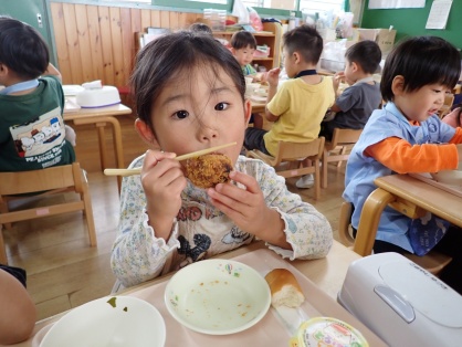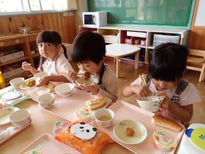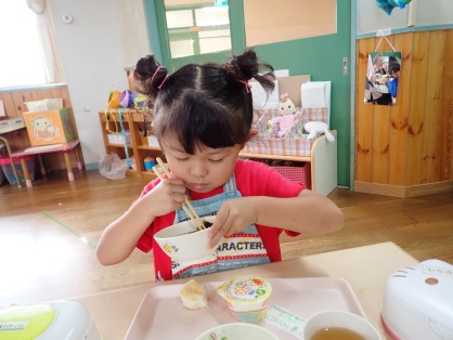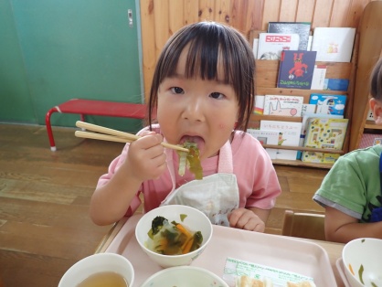 運動会の後から、給食での箸の使用が始まりました。箸が苦手な子は最初はスプーンで食べていましたが、今は箸を使って食べたいという気持ちが強くなってきているので、全員が箸を使って食べています。まだ箸で上手に挟むことは難しい子が多いので、箸の持ち方を一緒にやってみたり、刺してもいいよと声を掛けたりし、子どもたちの一生懸命箸で食べようとする気持ちを尊重しながら、箸を使って食べることが嫌にならないように、少しずつ練習しています。