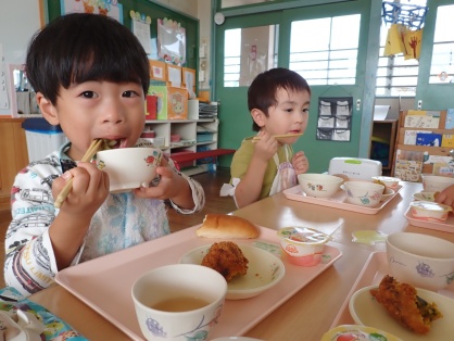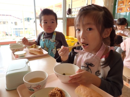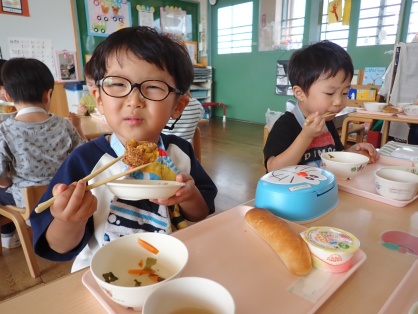 給食の時間が近づくと、2階のお部屋にいても給食のいい匂いがしてきます。子どもたちは、「先生、お腹すいた!」「早く給食食べようよ~」と給食を心待ちにしています。