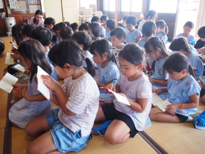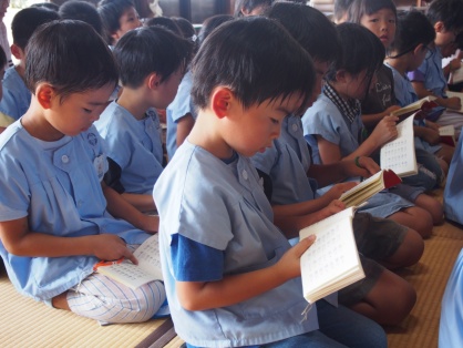静かに手を合わせて真剣に取り組む姿は、さすがに年長さん☆ 理事長先生からは「大きな声で上手に読めるようになってきたね。」と褒められ、嬉しそうな子どもたちでした。