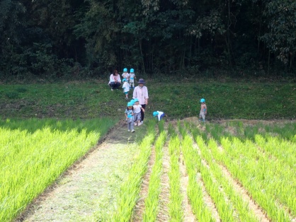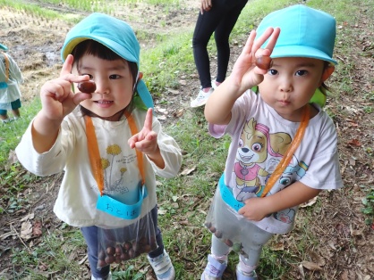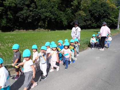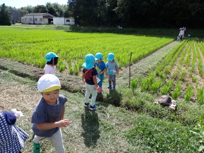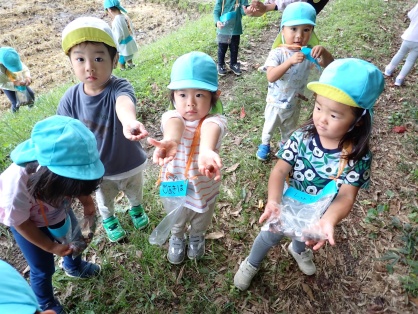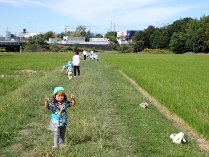 10月中旬になり、やっと日中も涼しくなってきました。今あひる2くみはお散歩ブームです。晴れた日、朝のおやつの時間になると、「せんせい、きょうもおさんぽいこうよ」と友だちの話し声を聞いて「たんぼにいきたーい」「やまのぼりしたーい」「どんぐりとりにいきたいな」と次々に子ども達のリクエストが始まります。