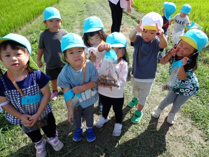 「せんせーい、きょうはとらっくいないね」などと会話を楽しんだり、どんぐりころころの歌やまつぼっくりの歌を歌うことを楽しんだりしながら、田んぼまで約500mの道のりを歩いて行きます。田んぼに到着すると、まずは真っすぐのあぜ道をヨーイドン!!走り終わると、どんぐり拾いがスタートします。「あった!」「こっちにも!」と目を輝かせて拾い、「これはママにプレゼントなんだ」と、どの子も大好きなお母さんが喜んでくれる顔を思い浮かべながら、大事そうにおさんぽバックにしまっていました。