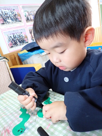 たい組は、白いガムテープを先生と一緒に切り、中が見えないように上手に貼って『鏡餅』を作りました。へび年なので、子どもたちが自分で顔を描いたへびもつけ、とっても可愛い『鏡餅』が出来ました!