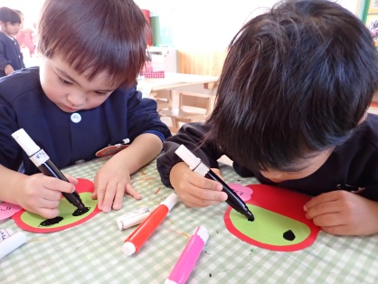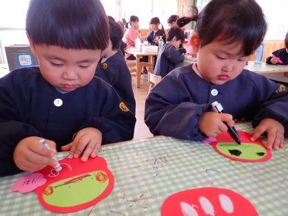 らっこ組は、へびの顔と、だるまの模様を描き『だるまへび』を作りました。きらきらの目の子、ほっぺやベロを描く子、色々な表情のへびができました。置いて、指でちょんちょんと触ると揺れる、とっても可愛い『だるまへび』の完成です!