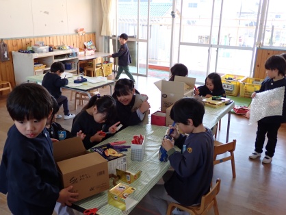 製作が大好きな年中長さんは、毎日、どこのクラスでも「何をつくろうかな」と製作を楽しむ姿が見られ、箱をカバンやロボットなど何かに見立てて作ったり、段ボールを切ったり丸めたりして思い思いの物を作っています。また、年長さんは「○○作りたいんだけど、色のガムテープ使っていい?」「画用紙使いたい」と作りたいものを具体的にイメージして使いたいものを選ぶ姿も見られます。クラスのロッカーの上はみんなの作品展示場のようで、箱をいくつもつなげた大きな作品や、細かな部分にまでこだわって作り上げた作品など、一人ひとりの個性豊かな作品がたくさん飾ってあります。