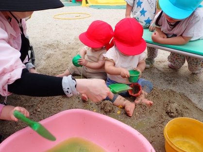 新しい環境での生活が始まり、もうすぐ3ヶ月がたとうとしています。少しずつ慣れてきたことで、どのクラスも笑顔がたくさん見られるようになってきました。あひる0組は、ハイハイや伝い歩き・かわいいよちよちの歩行で戸外や室内を探索活動中!その先にある好きな玩具を手に取ったり砂や葉っぱを触ったりと1人ひとりが「楽しい」を見つけて遊んでいます。中でも大好きになってきた砂場では、全身砂だらけでもへっちゃら!両手に砂を持ち保育士にプレゼントしてくれたり、葉っぱをちぎってバケツに入れたりと存分に楽しんでいますよ。これからも子ども達の「楽しい」を一緒に見つけていきたいです!
