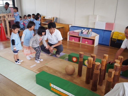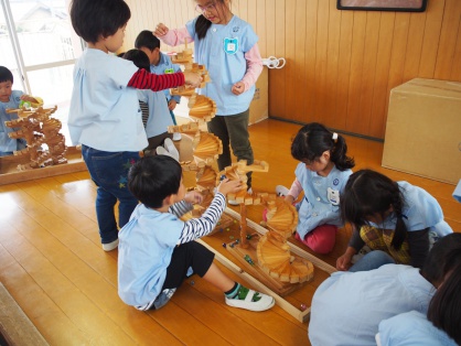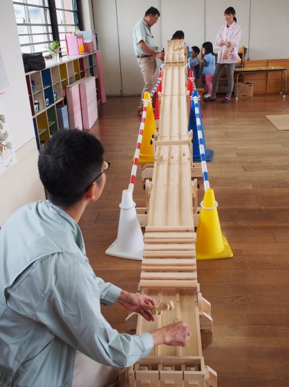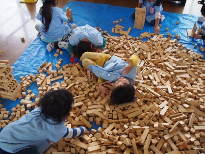 10月19日に、幼児クラスで「木育」を行いました。 カーレースやボーリング等、木で作られた様々な玩具を前日から準備して下さり、 子どもたちに木に触れる機会を作ってくださいました。 子どもたちはそれぞれ好きなコーナーで、木の遊びを楽しみました。 5000個の積み木のコーナーでは、色々な形や大きさの積み木に子どもたちも大喜び! 先生と一緒に並べ方・積み方を工夫しながら、自分たちの背の高さよりも高いタワーを作りました。