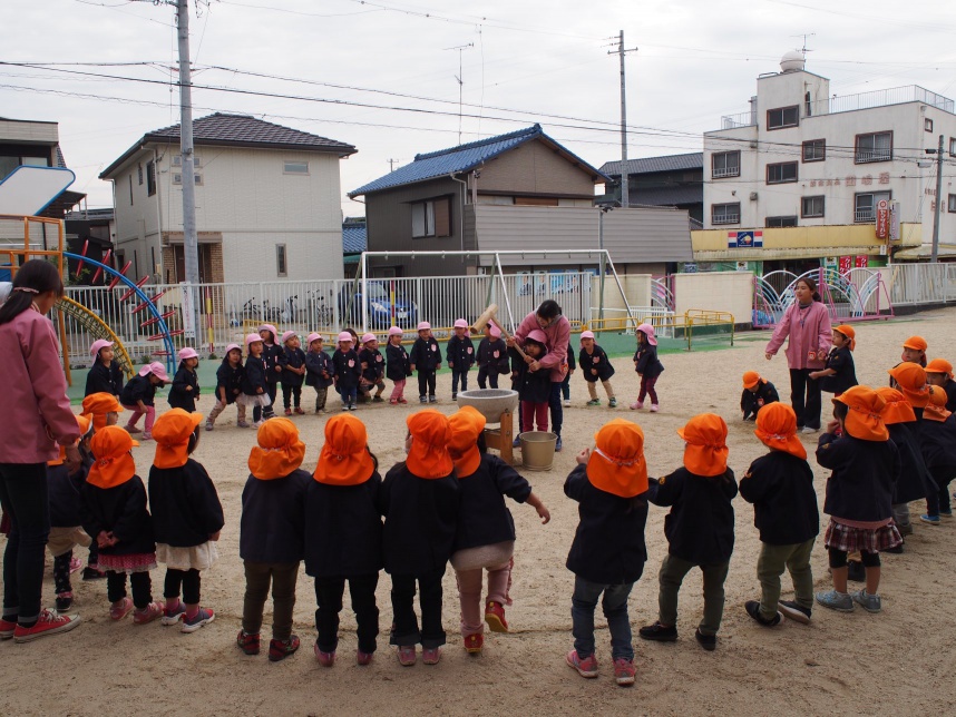 12月11日に、もちつきを行いました。 乳児さんはお部屋にて『もちつきごっこ』を楽しみ、 幼児さんは実際におもちをつきました。 一人ずつ、少し重たい杵を順番に持って、 みんなの「よいしょ!よいしょ!よいしょ!」という掛け声が、園庭に響いていましたよ。 その日のおやつは、きなこもち! どの子も美味しそうに食べて、笑顔いっぱいのもちつきとなりました。